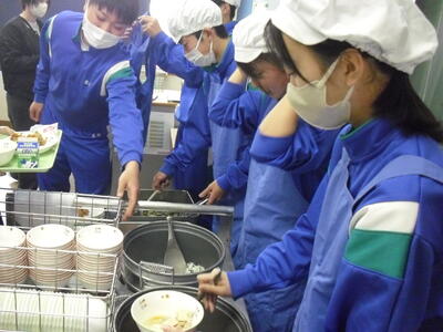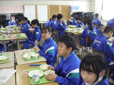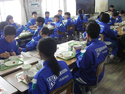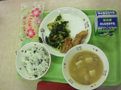 給食開始! 鴻巣中は12:45「いただきます!」を目指しています。-今日のメニューは鶏肉の唐揚げ、わかめご飯、ほうれん草サラダ、豚汁、お祝いデザート-