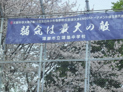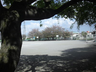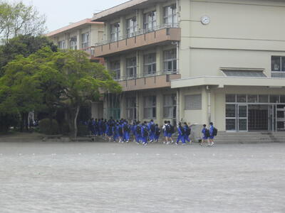 満開の桜の中の「避難訓練」 と 半世紀以上校庭を見続けてきている校木「もみじの木」