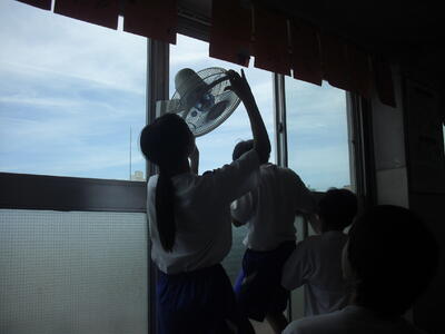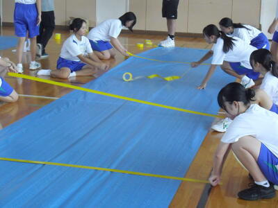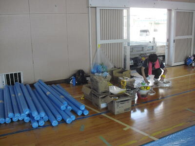 こうのす花火大会準備ボランティア(観覧席用ブルーシートを準備しています 於 鴻巣東小体育館)