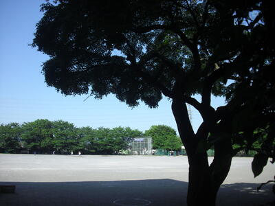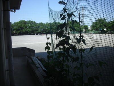 猛暑の校庭を見つめる「のぞみ学級の朝顔」と「校木(こうぼく)けやきの木」