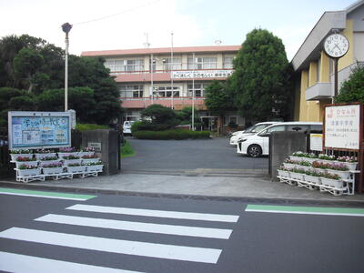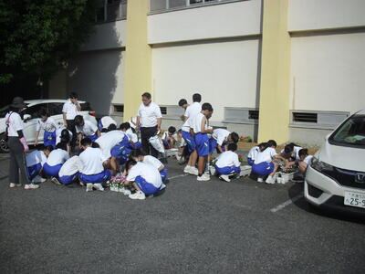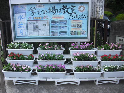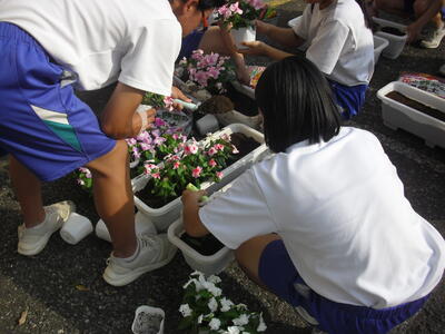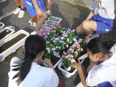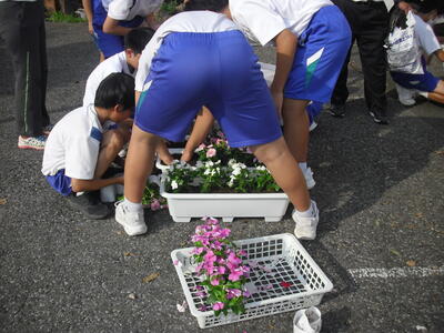 PTA共同作業を継ぎ、美化・JRC委員が花植え作業頑張りました。-猛暑にも負けるな、頼むぞ日々草 !-